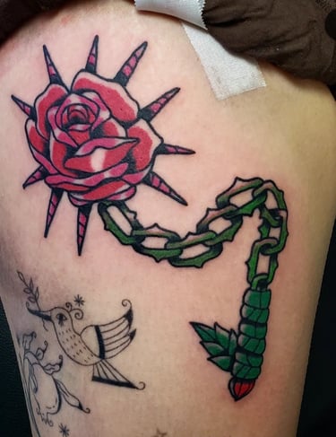 Ari (she/her) has been tattooing since 2024 and piercing since 2022. She enjoys tattooing bold and colorful designs. Check out her Instagram for available flash or contact her about custom pieces! Her favorite piercing to do is a bridge. <3